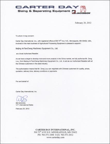 Carter Day公司充分授權(quán)北京安田成機(jī)械設(shè)備有限公司的劉東先生,在中國種業(yè)作為Carter Day公司的授權(quán)經(jīng)銷商。作為中國種業(yè)的授權(quán)經(jīng)銷商,我們有一個共同的目標(biāo)就是開發(fā)更多的項目在中國市場,對于CarterDay公司旗下所有產(chǎn)品,劉東先生代表Carter Day公司可以與中國客戶有權(quán)進(jìn)行質(zhì)量交涉、價格、報價、交付時間、交付或付款等等事項。