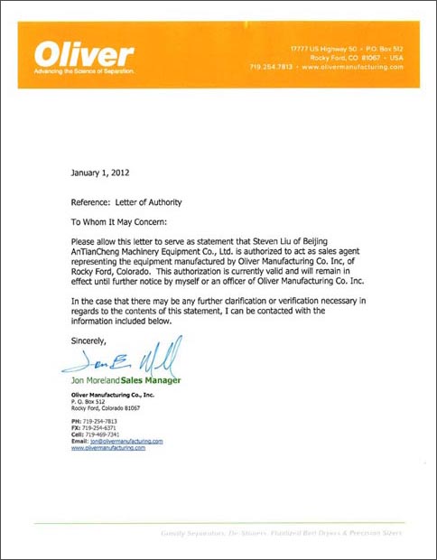 此授權(quán)書特此聲明來自北京安田成機(jī)械設(shè)備有限公司的劉東先生被我公司授權(quán)作為一級銷售代理商,代理銷售Oliver制造有限公司旗下所有產(chǎn)品,此授權(quán)書自發(fā)布之日起,將一直有效,直到Oliver制造有限公司發(fā)出新的聲明。